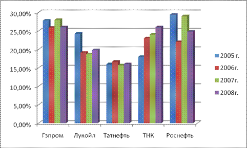Рис.5. Рентабельность по EBITDA крупнейших нефтяных компаний в период с 2005 по 2008 год. Как видно из диаграммы наибольшая рентабельность в 2005 году была у Роснефти и составляла 29,4%, однако в 2006 году картина изменилась и на первое место вышел Газпром с рентабельностью в 25,9%, но в 2007 году выросла рентабельность Роснефти до 29% и заняла лидирующее положение. В 2008 году на первом месте по рентабельности оказались Газпром и ТНК-ВР с 26%. Такая динамика показателей рентабельности существует из за того, что в разные периоды расходы и доходы компаний могут меняться в связи с разработкой новых месторождений которая увеличивает расходы, или покупка акций других предприятий которая приносит прибыль. Говоря о техническом состоянии компаний можно сказать, что на сегодня нефтяные предприятия не располагают современными техническими средствами для разработки трудноизвлекаемых запасов и эксплуатации месторождений, находящихся в поздней стадии. Основные фонды нефтепромыслов имеют большую изношенность и требуют своего обновления, прежде всего технологического оборудования и нефтепромысловых коммуникаций. Рост добычи нефти происходит путем увеличения отдачи от действующих скважин на основе использования традиционных технологий. Основными направлениями научно-технического прогресса в добыче нефти являются: создание и освоение технологий и оборудования, обеспечивающих высокоэффективную разработку трудноизвлекаемых запасов нефти, совершенствование существующих и создание новых методов воздействия на пласты и увеличения нефтеотдачи. НТП позволит не только увеличить объемы добычи нефти , но и поднять его качество. Но для осуществления этих проектов потребуются огромные инвестиции, которые преимущественно осуществляет государство. Используемые источники 1. www.gazprom-neft.ru 2. www.tnk-bp.ru 3. www.rosneft.ru 4. www.lukoil.ru 5. www.tatneft.ru 6. www.rating.rbc.ru |