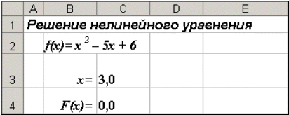 значения. Чтобы обнулить значение, хранящееся в ячейке Хтекущ, нужно заново записать туда формулу. Для этого достаточно для редактирования выбрать ячейку, содержащую формулу, дважды щелкнув мышью на ней (при этом содержимое ячейки отобразится в строке формул). Щелчок по кнопке (нажатие клавиши) Enter запустит вычисления с новым начальным приближением. 2.2. Подбор параметраКогда желаемый результат вычислений по формуле известен, но неизвестны значения, необходимые для получения этого результата, можно воспользоваться средством Подбор параметра, выбрав команду Подбор параметра в меню Сервис. При подборе параметра Excel изменяет значение в одной конкретной ячейке до тех пор, пока вычисления по формуле, ссылающейся на эту ячейку, не дадут нужного результата. Возьмем в качестве примера все то же квадратное уравнение х2 -5х+6=0. Для нахождения корней уравнения выполним следующие действия: В ячейку С3 (рис. 10) введем формулу для вычисления значения функции, стоящей в уравнении слева от знака равенства. В качестве аргумента используем ссылку на ячейку С2, т.е. =С2^2-5*C2+6.