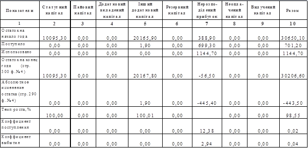 Анализируя собственный капитал, необходимо обратить внимание на соотношение коэффициентов поступления и выбытия. Если значения коэффициентов поступления превышают значения коэффициентов выбытия, значит, на предприятии идет процесс накопления собственного капитала, и наоборот. 2. Анализ "Отчета о собственном капитале" ОАО "Крымхлеб" Таблица № 2.14. – Анализ движения собственного капитала ОАО "Крымхлеб"
