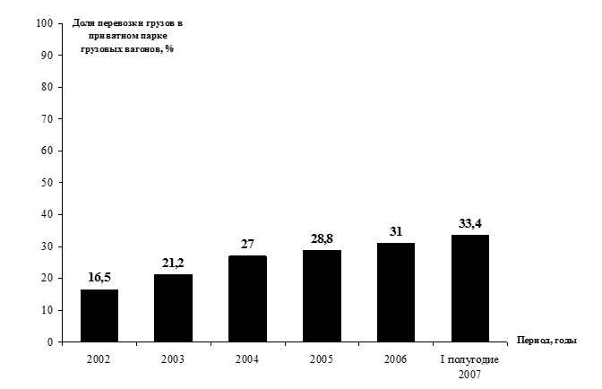 Наибольший пророст приватного парка происходил, главным образом, по вагонам, осуществляющим перевозки высокодоходных грузов (нефти и нефтепродуктов, контейнеров, скоропортящихся грузов, автомобилей и других готовых товаров), тем самым позволяя частным компаниям-операторам занимать наиболее прибыльные сегменты рынка грузовых перевозок. Ввиду того, что собственники предлагают более высокое качество обслуживания и более гибкие тарифные условия, грузовладельцы охотнее обращаются к частным компаниям. На сегодняшний день операторы подвижного состава осуществляют 67,1% перевозок нефти и нефтепродуктов. То есть, компаниями-операторами почти не осваиваются низкодоходные перевозки, которые приходятся на долю ОАО «РЖД» как общественного перевозчика. В самом начале реформирования ОАО «РЖД» позиционировало себя на рынке грузовых перевозок как компания, сохраняющая позиции на рынке перевозок высокодоходных грузов, а также осуществляющая перевозки массовых грузов в необходимом объеме с максимально возможной доходностью. Изначально в Программе структурной реформы ОАО «РЖД» планировался переход в частную собственность до 50% парка грузовых вагонов. Однако не оговаривалось, касается ли это всего парка в целом или каждого рода вагонов. В связи с потерей позиций ОАО «РЖД» в высокодоходных сегментах транспортного рынка, в Программу была внесена поправка: обеспечить в активе ОАО «РЖД» 50% по каждому роду вагонов. Это требовало бы активной закупки высокодоходного подвижного состава, соответственно, влекло бы за собой дополнительные расходы: на приобретение и содержание. А значит, будет иметь место противоречие цели «снижения совокупных народно-хозяйственных затрат при перевозке грузов железнодорожным транспортом». Кроме того, серьезной проблемой является и высокая доля физически и морально устаревших фондов, прежде всего, подвижного состава: свыше 80% по вагонам и более 70% по локомотивам. А укрепление позиций ОАО «РЖД» на транспортном рынке требует качественной модернизации производственной базы. Таким образом, вследствие потери доли рынка, высокой степени износа парка вагонов и необходимости его обновления, ОАО «РЖД» вынуждено искать новые пути развития компании, которые могли бы позволить переломить негативные тенденции. Одним из таких мероприятий является выделение из структуры ОАО «РЖД» дочерних компаний с выходом на конкурентный сектор транспортных услуг. Помимо выделенных дочерних обществ в области грузовых контейнерных и специализированных перевозок грузов в изотермическом подвижном составе, было принято решение о создании дочерней компании, занимающейся перевозкой всех остальных грузов. Вопрос создания дочерней Грузовой компании обсуждался Правлением ОАО «РЖД» 13 июля 2006 года, начало ее деятельности запланировано на осень 2007 года. Как отмечает президент ОАО «РЖД» В.Якунин, ее появление позволит решить следующие задачи: − обеспечить конкурентоспособность грузоперевозочного бизнеса ОАО «РЖД» за счет равных тарифных условий с другими участниками рынка грузовых перевозок; − имущественно обособить грузоперевозочный бизнес для обеспечения его прозрачности, повышения финансово-экономической эффективности и ликвидации перекрестного субсидирования других видов перевозок; − обеспечить инвестиционную при
