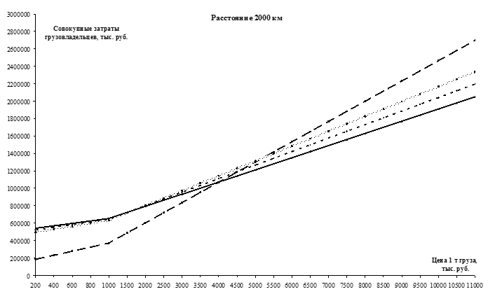 Рис. 3.3. Совокупные затраты грузовладельцев при доставке грузов по железной дороге с применением разных технологий и автомобильным транспортом на расстояние 2000 км и 4000 км Выполненные расчеты совокупных затрат грузовладельцев на перевозку партии груза на расстояние 2000 км и 4000 км автомобильным и железнодорожным транспортом с применением разных технологий позволили сделать следующие выводы: − при действующей технологии железнодорожных перевозок на расстояние 2000 км грузовладельцу целесообразно перевозить партию груза (96 т) ценой до 5000 тыс. руб./т с участием железнодорожного транспорта групповыми отправками. Более дорогие грузы на расстояние 2000 км целесообразно перевозить автомобильным транспортом. При перевозке на расстояние 4000 км с точки зрения грузовладельца железнодорожный транспорт целесообразно использовать для перевозок партии груза стоимостью до 10500 руб./т. При большей цене груза для перевозки целесообразно использовать автомобильный транспорт; − применение малосоставных составительских маршрутов на расстоянии перевозки 2000 км нецелесообразно с точки зрения грузовладельца, однако имеет смысл при перевозке груза на расстояние 4000 км стоимостью свыше 7000 руб./т; − применение малосоставных составительских маршрутов, следующих по пассажирским ниткам графика движения поездов, делает целесообразным использование железнодорожного транспорта для перевозки партии груза на расстоянии 2000 км и 4000 км во всем интервале цен грузов от 200 тыс. руб./т до 11000 тыс. руб./т. При этом для железнодорожного транспорта распределение грузов разной стоимости по видам отправок изменяется. На расстоянии перевозки 2000 км малосоставные составительские маршруты, следующие по пассажирским ниткам графика движения поездов, эффективны при перевозке грузов стоимостью от 4500 тыс. руб./т и выше. При расстоянии перевозки 4000 км малосоставные составительские маршруты, следующие по пассажирским ниткам графика движения поездов, становятся эффективными при перевозке партии грузов стоимостью от 6000 тыс. руб./т и выше. Рассмотренный пример демонстрирует принципиальную возможность и направление совершенствования технологии перевозок высокоценных грузов. Необходимо отметить, что решение задачи привлечения дополнительных объемов высокоценных грузов требует комплексного решения, связанного с пересмотром традиционного подхода к оценке работы железнодорожного транспорта. Например, эффективность эксплуатационной работы оценивается рядом объемных и качественных показателей работы железнодорожного транспорта и подвижного состава в частности. К числу важнейших из них относится производительность локомотива и средняя масса поезда брутто. Применение малосоставных составительских маршрутов приводит к ухудшению этих показателей. В табл. 3.8 приведена среднесуточная производительность локомотива в зависимости от типа отправки. Таблица 3.8 Среднесуточная производительность локомотива в зависимости от типа отправки