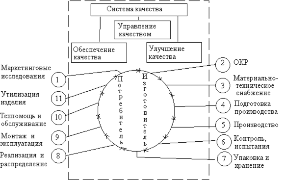 Рисунок 7.2 Принципы организации кружков качества Принципы организации кружков качества: добровольность участия; стремление к коллективным формам поиска правильных решений, их оперативное рассмотрение, внедрение в производство принятых предложений; моральное и материальное удовлетворение достигнутыми успехами, стимулирование результатов творческой деятельности; поддержка инициативы руководством и общественными организациями на всех уровнях управления предприятием; обеспечение гласности и пропаганды их деятельности всеми формами и средствами массовой информации, обобщение и распространение опыта работы. Кружки качества первоначально возникли в США, однако существенный импульс этому движению дали японские фирмы, где произошел и качественный, и количественный рост кружков. Затем они охватили страны Европы, Америки и Азии. Кружки качества помогают предприятиям решать как технико-экономические, так и социально-психологические задачи предприятия. Пример: «Три-четыре человека, обслуживающие тот или иной технологический процесс или часть этого процесса, остаются после работы и обсуждают так называемые «узкие места»: повышение качества, рост эффективности, снижение затрат. Они могут собираться и обсуждать проблемы (от 1-ой до 3-х) 1-2 раза в месяц и обсуждать от 1 до 3 тем». Кружки качества распространены во всем мире. Они представляют собой важный элемент общественного участия в управлении качеством наряду с обществами потребителей. Главными регламентирующими условиями в управлении системой качества, являются международные стандарты. Международные стандарты семейства ИСО 9000 сосредотачивают свои рекомендации и требования на удовлетворении потребителя. Семейство международных стандартов ИСО 9000 делает различие между требованиями к системе качества и требованиями к продукции - требования к системе качества являются дополнительными по сравнению с техническими требованиями к продукции. Стандарты семейства ИСО 9000 написаны в форме задач системы качества, которые предприятию предстоит выполнить. Данные международные стандарты не описывают, как достичь решения этих задач, но представляют такой выбор руководству предприятия. В ИСО 9000 выделяется четыре общие категории продукции: - оборудование (технические средства); - интеллектуальная продукция (средства), под которым понимается продукт интеллектуальной деятельности, включающий в себя информацию, выраженную через средства поддержки; интеллектуальная продукция может быть как в форме программ для компьютера, так и в форме концепций, протоколов или методик; - перерабатываемые материалы, под которыми понимается материальная продукция, получаемая путем переработки сырья в заданное состояние; перерабатываемые материалы могут представлять собой жидкость, газ, специфические материалы, слитки, прутки или листы; перерабатываемые материалы поставляются обычно в барабанах, мешках, цистернах, баллонах, канистрах, по трубопроводам и т.д.; - услуги. Концептуальной основой ИСО 9000 является то, что организация создает, обеспечивает и улучшает качество продукции при помощи сети процессов, которые должны подвергаться анализу и постоянному улучшению. Для обеспечения правильного управления процессами, организации взаимодействия между процессами в сети, ИСО 9000 предполагает, ч