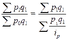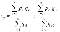 Из формулы ip = p 1 / p 0 определяем р0 =р1 / ip подставляем его в знаменатель агрегатной формулы и получаем средний гармонический индекс цен, который тождественен формуле Пааше: Ip