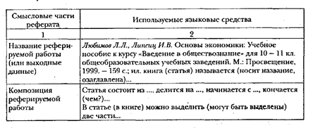1 В книге изложена концепция практической психологии в связи с гуманитаризацией высшего образования в современных условиях. Книга состоит из четырех частей. В первой части дается анализ психологии индивидуальности, предлагаются психологические тесты, которые помогут составить психологический портрет индивидуальности. Во второй части раскрываются особенности групповой деятельности, общения и конфликтный ситуаций. В третьей части дается анализ профессиональной и предпринимательской деятельности, инженерного творчества, психологии безопасности и рекламы. В заключительной, четвертой части раскрываются проблемы психологии личной и обыденной жизни, психологии здоровья, внутренней гармонии. Даются рекомендации и упражнения по выходу из психологических кризисов и выбору жизненных позиций: выигрывающего и проигрывающего. Книга может быть рекомендована как учебник по курсу психологии для вузов и для широкого круга читателей и специалистов. Ил. 11. Табл. 2. Библиогр.: 91 назв. 2 Настоящее учебное пособие адресовано учащимся старших классов и предназначено для использования в рамках интегрированного курса «Введение в обществознание» в 10–11 классах общеобразовательной школы. Оно дает краткое систематическое изложение важнейших категорий и понятий современной экономической науки и призвано помочь учащимся разобраться в экономических причинах и закономерностях социально-политических процессов, происходящих в России. 3 Предлагаемый читателю сборник включает краткое содержание докладов, прочитанных на международной научно-практической конференции «Тенденции развития языкового и литературного образования в школе и вузе». Разнообразие тематики публикуемых материалов обусловлено широтой проблем, интересовавших участников конференции: теория и методика преподавания родного языка и литературы, сопоставительное изучение иностранных языков, вопросы методики обучения русскому языку как иностранному. РеферированиеСлово реферат происходит от латинского referre, что значит «докладывать, сообщать». В настоящее время рефератом называют прежде всего краткое, чаще всего письменное, изложение научной работы – статьи или книги (или нескольких научных работ). Изложение одной работы обычно содержит указание на тему и композицию реферируемой работы, перечень ее основных положений с приведением аргументации, реже – описание методики и проведение эксперимента, результатов и выводов исследования. Такой реферат будем называть простым информационным. В России издаются специальные реферативные журналы, которые содержат подобного рода рефераты и тем самым знакомят с новейшей российской и зарубежной литературой в различных областях научных знаний: в физике, философии и т.д. Студенты в российских вузах пишут рефераты обычно на определенные темы, которые предлагаются им на кафедрах общеинженерных и общественных дисциплин. Для написания таких, тематических рефератов может быть необходимо привлечение более, чем одного источника, по крайней мере двух научных работ. В этом случае реферат является не только информационным, но и обзорным. Ниже приводится перечень типичных смысловых частей простого информационного реферата и используемых в каждой из них типичных языковых средств.