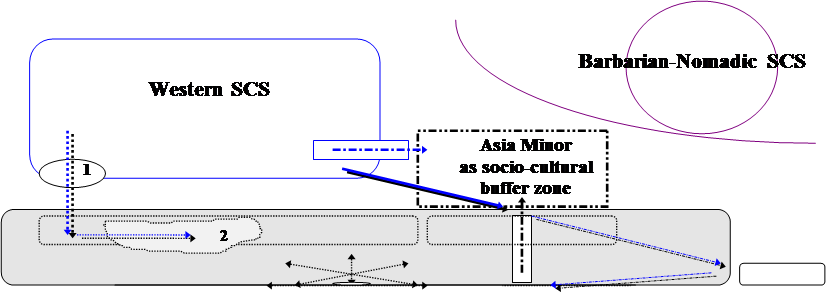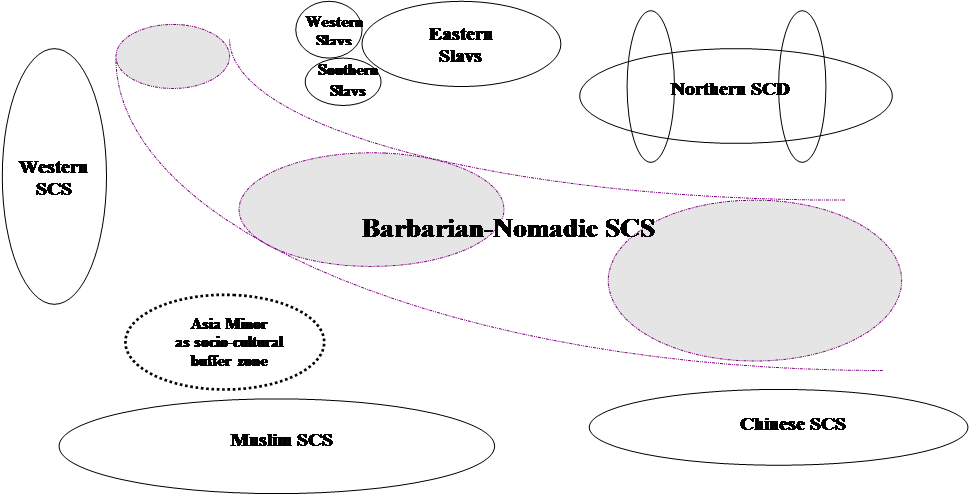 6.1. BARBARIAN-NOMADIC SCS Model 1 . Initial period of the Barbarian-Nomadic SCS existence, surrounded by neighbours not internally ready to integrate with it socio-culturally (from ansient times until I century AD)