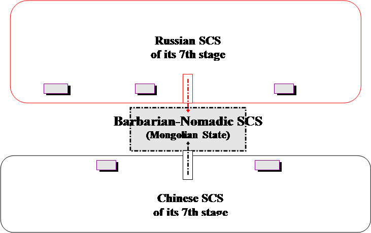 Model 19. Socio-cultural integration with Barbarian-Nomadic SCS. Creating the internal buffer zones, naturally dependent vassals and homeland growth on the South. Unification of the socio-culturally transformed territories into the united state (from 1211 until 1840-s)