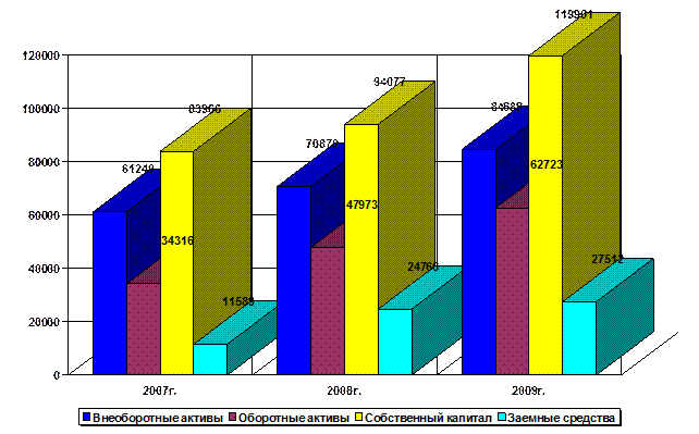 За 2008 год по сравнению с 2007 г. прирост активов предприятия составил 23288 тыс. руб. или 24,37 %, в том числе за счет увеличения объема недвижимого имущества на 9630 тыс. руб., и за счет оборотных средств – на 13657 тыс. руб. Структура баланса приведена на рис.4. Как видно из таблицы 1, за 2009 год по сравнению с 2008 г. прирост активов предприятия составил 28569 тыс. руб. или 24,04 %, в том числе за счет увеличения объема недвижимого имущества на 13819 тыс. руб., и за счет оборотных средств – на 14750 тыс. руб. т. е., за 2009г. в оборотные активы было вложено в 1,07 раз больше средств, чем в недвижимое имущество. Оборотные активы на 2009 г., как и в 2007 - 2008 г. характеризуются преобладанием дебиторской задолженности, которая выросла в 2009 г. на 12572 тыс. руб., т.е. на 4,43% по сравнению с 2008 ; и в 2008г. на 6955 тыс.руб. или на 1,05% в сравнении с 2007 г. Рост суммы дебиторской задолженности ведет к отвлечению денежных средств предприятия из оборота (из группы наиболее ликвидных активов).