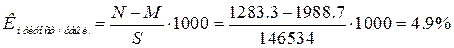 По полученным данным мы видим, что за год ВНП снизился на 69%. Задача № 3 Естественное движение населения РФ за отчетный год характеризуется данными, тыс. чел.: - численность постоянного населения на начало года – 146740, в т.ч. женщины в возрасте 15-49 лет – 39048; - численность постоянного населения на конец года – 146328, в т.ч. женщины в возрасте 15-49 лет – 38805; - в течение года: родилось – 1283,3; умерло – 1988,7; умерло детей в возрасте до 1 года – 21,097. Определить: - среднегодовую численность населения. Решение: 1. Определим среднегодовую численность населения:
