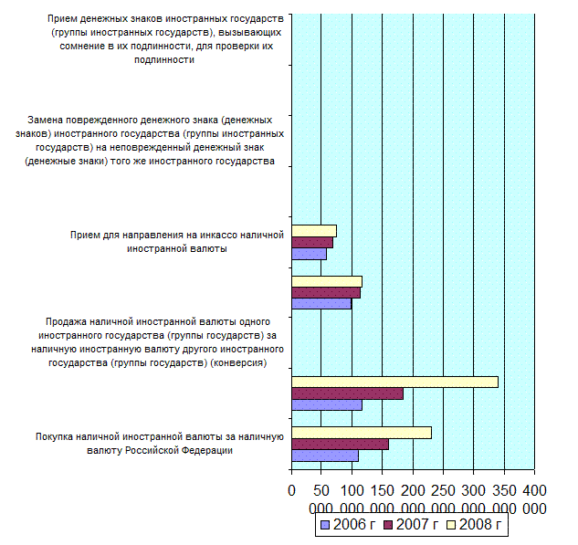 2.3 Анализ операций осуществляемых ОАО «Росбанк» сналичной иностранной валютойПеречень операций с наличной иностранной валютой, совершаемых 1) покупка наличной иностранной валюты за наличную валюту Российской Федерации; 2) продажа наличной иностранной валюты за наличную валюту Российской Федерации; 3) продажа наличной иностранной валюты одного иностранного государства (группы государств) за наличную иностранную валюту другого иностранного государства (группы государств) (конверсия); 4) размен денежного знака (денежных знаков) иностранного государства (группы государств) на денежные знаки (денежный знак) того же иностранного государства (группы государств); 5) прием для направления на инкассо наличной иностранной валюты; 6) покупка поврежденного денежного знака (денежных знаков) иностранного государства (группы государств) за наличную валюту Российской Федерации; 7) замена поврежденного денежного знака (денежных знаков) иностранного государства (группы иностранных государств) на неповрежденный денежный знак (денежные знаки) того же иностранного государства (группы иностранных государств) ; 8) прием денежных знаков иностранных государств (группы иностранных государств), вызывающих сомнение в их подлинности, для направления на экспертизу; 9) прием денежных знаков иностранных государств (группы иностранных государств), вызывающих сомнение в их подлинности, для проверки их подлинности. Таблица 4 – Анализ операций с наличной иностранной валютой [17]