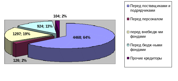 Анализ таблицы 2.9. показывает, что рост дебиторской задолженности с 2008 по 2009 год обусловлен увеличением долга покупателям и заказчикам на 1497 тыс. рублей или 26%. В результате чего произошло увеличение кредиторской задолженности, в частности, поставщикам и подрядчикам на 1028 тыс. рублей (30%) (См. Рис. 2.5.), в фонд социального страхования и обеспечения на 158 тыс.рублей (14%) и перед бюджетом на 123 тыс.рублей (15 %). 2008 год 2009 год Рисунок 2.5. Структура кредиторской задолженности 2008 – 2009 гг. Следует отметить положительные сдвиги по оплате труда на 57 тыс. рублей (31%). Анализ собственных оборотных средств и текущих финансовых потребностей показывает превышение первых над вторыми на сумму 1172 тыс.рублей. Это свободный остаток денежных средств из которого можно было бы оплатить ближайшие расходы, сформировать необходимый страховой запас наличности или же сделать краткосрочные финансовые вложения. Этот резерв денежной наличности не был использован, а следовательно не принес дохода. Любое предприятие стремиться к разумному сокращению текущих финансовых потребностей и этого можно достичь путем уменьшения запасов сырья и материалов и дебиторской задолженности, и увеличения срока оплаты кредиторской задолженности. Оборачиваемость всех оборотных средств замедлилась на 83 дня к концу 3 кв. 2009 года, что привело к замораживанию этих оборотных средств из оборота на сумму 3122 тыс.рублей. Это свидетельствует о росте неплатежеспособных дебиторов. В целом рост дебиторской задолженности не желателен и является с одной стороны результатом проводимой экономической политике в стране, которая способствовала свертыванию производства сети промышленных предприятий, упадку сельского хозяйства, недостаточности финансирования бюджетной сферы, что обусловило низкий уровень денежной массы в расчетах, а с другой - ослабление финансовой и расчетно-платежной дисциплины, ухудшение контроля за дебиторскими счетами. За счет увеличения дебиторской задолженности предприятие не может своевременно рассчитаться по своим краткосрочным обязательствам. Высокая доля приходиться на задолженность перед поставщиками, социальному страхованию, перед бюджетом. Тем не менее, ОАО «Актив Плюс» в полной мере обеспечен собственными оборотными средствами. В соответствии с Приказом Министерства Экономики РФ от 01.10.1997г. № 118 «Методические рекомендации по разработке финансовой политики предприятия» [2] и Распоряжением ФУДН № 31-р «Методические положения по оценке финансового состояния предприятий» [4] структура баланса предприятия на конец отчетного периода признается удовлетворительной, а организация платежеспособной. Высокий уровень данного коэффициента обусловлен большой долей оборотных активов в имуществе и добавочного капитала в источниках. В целом улучшение состояния оборотных средств зависит от опережающего роста суммы собственных оборотных средств по сравнению с ростом материальных запасов. Зависимость можно определить и исходя из того, что собственных оборотных средств у предприятия тем больше, чем меньше внеоборотных активов приходиться на рубль источников собственных средств. Понятно, что стремиться к уменьшению внеоборотных активов (или к относительно медленному их росту) не всегда целесообразно. Увеличить собственные оборотные средства можно с помощью ув
