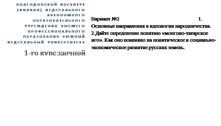 ОГЛАВЛЕНИЕ Цели и задачи работы. Цель данной работы состоит в рассмотрении основных направлений в идеологии народничества. Дать определение понятию «монголо-татарское иго» Дать определение влияния иго на русскую историю. Для достижения поставленной цели в работе решаются следующие частные задачи: 1. рассмотреть основные направления в идеологии народничества; стр.2 2. дать характеристику пропагандистскому направлению народничества; стр.7 3. дать характеристику анархическому (бунтарскому) направлению народничества; стр.9 4. дать характеристику заговорщическому направлению народничества; стр.11 5. дать определение понятию «монголо-татарское иго»; стр.12 6.охарактеризовать влияние «монголо-татарское иго» на политическое и социально-экономическое развитие русских земель; стр.13 7.Вывод. стр.17 8.Список использованной литературы. стр.18 Объект исследования - народничество 1870-х гг. Предметом исследования являются общественные отношения, связанные с рассмотрением народничества 1870-х гг. Основная часть Глава 1. Основные направления в идеологии народничества. Народничество — идеология интеллигенции в Российской империи в 1860—1910-х годах, ориентированная на «сближение» с народом в поиске своих корней, своего места в мире. Движение народничества было связано с ощущением интеллигенцией потери своей связи с народной мудростью, народной правдой. Основоположниками народничества были А.И. Герцен и Н.Г. Чернышевский, которые в 1850-х гг. разработали его основные теоретические положения. Герцен и Чернышевский резко критиковали существующий крепостнический и самодержавный строй, они были радикальными демократами, но стремились избежать насилия. Однако многие адепты классиков народничества истолковали их теорию как призыв к народной революции. Основными идейными принципами народничества являлись: отрицание исторического значения капитализма и стремление не допустить его развитие в России; стремление создать социалистическое общество, как систему общественных отношений, основанных на справедливости и коллективизме; лишь в солидарном и справедливом обществе существуют условия, обеспечивающие всестороннее развитие личности; идеализация крестьянской общины и надежды через нее прийти к социализму; представление о русском крестьянине как о человеке будущего, "социалисте по природе"; критика или даже отрицание государственности как формы общественного управления, отрицание до конца 1870-х гг. значения политической борьбы за свободы и права личности. В 60-е гг. XIX в. определились различия в решении вопроса о том, как идти к социализму. Сам Герцен, не отрицая революции как «последнего довода угнетенных», предпочитал реформы, проводимые властью под давлением прогрессивного общественного мнения. Н. Г. Чернышевский считал единственно возможным революционный путь к социализму, но утверждал, что для революции должны сложиться определенные политические и экономические условия. Н. А. Ишутин, С. Г. Нечаев призывали к немедленному революционному бунту, уверяя, что для революционера нравственно все, «что способствует революции». В начале 70-х гг. народническое движение вступило в новый этап. Сформировались три основных идейных течения (идеологических направления) - пропагандистское, бунтарское и заговорщическое.