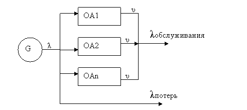 Любая заявка может быть обслужена любым свободным каналом. Если все каналы заняты, заявка немедленно получает отказ в обслуживании и покидает систему (теряется). Интенсивности входных и выходных потоков: