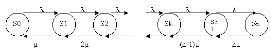 Из состояния Si-1 всегда с интенсивностью входного потока λ система переходит в следующее состояние Si, т.е. в данном случае будет заняе еще один канал и интенсивность перехода в следующее состояние равно интенсивности входного потока λ. Интенсивность обратного перехода возрастает с ростом числа параллельно работающих каналов. Чем больше их работает, тем интенсивнее процесс их освобождения. Для простейших потоков имеем: