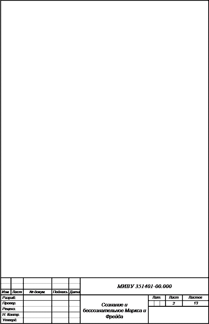 1 Сознание и бессознательное Маркса 2 Учение о сознании и бессознательном Фрейда. Психоанализ 3 Фрейдомарксизм Список используемой литературы Введение «Сознательное» и «бессознательное» - это соотносительные понятия, выражающие особенности работы человеческой психики. Человек обдумывает ситуации и принимает решения. Такие действия называют осоз На протяжении длительного времени в науке и философии доминировал принцип антропологического рационализма: человек, мотивы его поведения и само бытие рассматривались только как проявление сознательной жизни. Этот взгляд нашел яркое воплощение в знаменитом высказывании французского ученого и философа Р. Декарта «Мыслю, следовательно, существую». Человек в данном случае выступал лишь как «человек разумный». Но начиная с Нового времени в учении о человеке все большее место занимает проблема бессознательного. Такие мыслители, как Лейбниц, Кант, Кьеркегор, Рартман, Шопенгауэр, Ницше, начали анализировать роль и значение психических процессов, не осознающихся человеком, с разных сторон. Термины “бессознательное”, “подсознательное”, “неосознанное” часто встречаются в научной и художественной литературе, в обыденной жизни. Ни одно произвольное действие человека не бывает на всех этапах своего осуществления одинаково ясно осознанным. Бессознательное проявляется и в так называемых импульсивных действиях, когда человек не дает себе отчета в после И. Кант связывал понятие бессознательного с чувственным познанием, с интуицией. Он указывал на наличие сферы восприятий и чувств, которые не осознаются, хотя и можно прийти к выводу об их существовании. Бессознательное — это темные представления в человеке, число которых безгранично. На огромной карте нашего духа "освещены только немногие пункты". А. Шопенгауэр выдвинул иррационалистическую концепцию бессознательного, рассматривая его как волю в природе, источник жизни, стихийное жизненное начало, которому противостоит беспомощное сознание. Продолжателем иррационалистических идей выступил Э. Гартман признавал основой всего сущего бессознательное духовное начало, образующее абсолютное единство воли и идеи. Бессознательное незаметно управляет человеческим разумом. Проблемы соотношения сознательного и бессознательного рассматривались многими учеными. В данном реферате описаны основные положения учений Маркса и Фрейда. 1 Сознание и бессознательное Маркса Маркс ввел в научный оборот ряд своеобразных предметов и эвристических схем мышления о сознании, впервые прорвавших рамки традиционной классической философии. При этом Если для классической философии, являвшейся по своей сути «философией самосознания» и приписывавшей сознанию телеологическую структуру, жизнь последнего протекала только в одном измерении – в измерении восприятия и представления, воспроизводимых рефлексивным сознанием субъекта, то Маркс впервые вводит сознание в область научного детерминизма, открывая его социальное измерение, его социальные механизмы. Вместо однородной, уходящей в бесконечность плоскости сознания выявились его археологические глубины; оно оказалось чем-то многомерным, объемным, пронизанным детерминизмами на различных одновременно существующих уровнях – на уровнях механики социального, механики бессознательного, механик