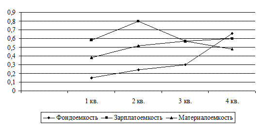 Рис. 2.1 Динамика абсолютных показателей ОАО ИК «Церих Кэпитал Менеджмент» Из графика динамики абсолютных показателей видно, что в исследуемом периоде, характеризующим деятельность ОАО ИК «Церих Кэпитал Менеджмент», себестоимость продукции и прибыль (в рассматриваемом случае убыток) находились в прямо пропорциональной зависимости. Себестоимость относительно базового периода увеличилась в 0,4 раза. Это произошло за счет увеличения материальных затрат, прочих затрат и затрат на оплату труда. Несмотря на увеличение выручки в четвертом квартале на 8% относительно первого квартала, убыток от продаж увеличился в 5 раз. Стоимость основных средств увеличилась в 4,5 раза за счет приобретения и введения в эксплуатацию нового оборудования. Стоимость оборотных активов изменялась за счет дебиторской задолженности: постепенно росла в течении года (в четвертом квартале она в 0,5 раз больше по сравнению с первым). Увеличение дебиторской задолженности объясняется за счет задолженности перед прочими дебиторами. Далее необходимо проанализировать уровень и динамику относительных показателей. Проведем, прежде всего, анализ структуры себестоимости, данные для которого представлены в табл. 2.3. Структура затрат характеризует удельный вес каждого экономического элемента в общей сумме затрат. Удельный вес затрат в составе себестоимости определяется по формуле: Yi = Ci / ∑Ci, (3) где Yi – удельный вес в составе себестоимости; Ci – величина элемента себестоимости; ∑Ci – общая сумма затрат на производство продукции. Результаты расчета относительных величин структуры представлены в таблице 2.3. Таблица 2.3 Динамика структуры себестоимости