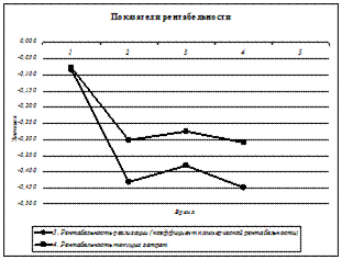 Рис. 2.18 Анализ деловой активности Рассчитав анализ динамики показателей, видно, что оборачиваемость активов низкая и незначительно увеличивается только к 3 периоду. Из этого следует, что активы используются не достаточно эффективно. Оборачиваемость запасов имеет очень низкий показатель, равный 0, который не улучшается на протяжении всего периода исследования (см. рисунок 2.16). Это означает, что скорость реализации запасов равна 0. Показатели фондоотдачи также снижаются. Если в 1 квартале на 1руб. основных средств приходится 6,4 руб. выручки, то в 4 квартале всего 1,5 руб. Скорость обращения дебиторской задолженности снизилась в 3 раза к 4 периоду. Следовательно к этому периоду увеличивается время оборачиваемости и принимает более неблагоприятное для предприятия значение. Для взыскания дебиторской задолженности в 4 квартале необходимо 3350 дней. Оборачиваемость запаса является не эффективным, т. к. за исследуемый период его использование не наблюдалось. Операционный цикл увеличивается, что является отрицательной тенденцией. В 4 квартале составляет 3350 дней. Скорость оборота готовой продукции остается на протяжении всего исследуемого периода равной 0 (см. рисунок 2.18). Из динамики оборачиваемости оборотного капитала прослеживается тенденция постепенного убывания. Только в 3 периоде прослеживается небольшое увеличение оборачиваемости оборотного капитала (см. рисунок 2.17). Оборачиваемость собственного капитала имеет тенденцию увеличения, но только к 3 и 4 периодам (после резкого спада во 2 периоде), данный показатель достиг уровня 1 периода. Оборачиваемость общей задолженности аналогично оборачиваемости оборотного капитала постепенно снижается (см. рисунок 2.17), однако это является положительной тенденцией, то есть все меньше оборотов необходимо для покрытия всех обязательств предприятия. В 4 периоде показатель имеет наиболее оптимальное значение около одного оборота. Оборачиваемость привлеченного финансового капитала равен 0, поэтому динамику проследить невозможно. Большинство показателей в первом квартале принимают свои лучшие значения, следовательно, можно сделать вывод о том, что в данном случае можно судить о наличии фактора сезонности в деятельности предприятия. 2.9 Анализ рентабельности Показатели рентабельности характеризуют эффективность видов деятельности или эффективность использования ресурсов предприятия. Показатели данной группы, как и показатели деловой активности, интересуют всех пользователей. Таблица 2.14 Показатели рентабельности