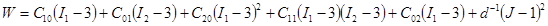 где I 1 – первый инвариант девиатора деформации, I 2 – второй инвариант девиатора деформации, C 10 , C 01 , C 11, С20, С02 – материальные константы, d – коэффициент несжимаемости материала, J – детерминант матрицы градиента деформации. Константы гиперупругости (C 10 , C 01 , C 11, С20, С02 ) в выражении для функции плотности энергии деформаций материала количественно определяют его механическое поведение. Эти константы определяются по диаграммам деформирования, получаемым при испытании образцов материала. В нашей работе использовались диаграммы, как заимствованные из литературы, так и полученные в специально проведенных испытаниях. Для моделирования свойств материала подошвы применяется 3-х параметрическая модель Муни-Ривлина. Применение в работе метода иерархического моделирования предусматривает несколько этапов решения рассматриваемой задачи. На первом этапе производится расчет всей конструкции модели – глобальной модели, на втором рассчитывается подмодель – наиболее нагруженная зона всей конструкции. При необходимости расчет может включать и третий этап с еще более подробной детализацией рассматриваемой небольшой частью подмодели предыдущего уровня. Метод подмоделей при решении задач позволяет получить не только более точные результаты в изучаемой области. Он облегчает рассмотрение разных вариантов конструкции и ее оптимизацию. Моделирование поведения деталей низа обуви основано на расчетах конструкции методом конечных элементов и предусматривает: 1) создание геометрической модели исследуемой конструкции; 2) создание конечно-элементной модели конструкции; 3) приложение к модели граничных условий, решение задачи методом конечных элементов, анализ результатов расчета. С целью получения геометрических моделей исследуемых деталей и конструкций в работе применен метод компьютерного моделирования. Были созданы несколько видов моделей: а) модель для анализа условий испытаний образца материала, включающая кроме самого образца в зажимы и прижимной ролик; б) модель обуви, содержащая детали верха и низа; в) модель многослойной конструкции низа обуви, включающая подошву с рифлением. Моделирование условий испытаний термоэластопласта в пакете конечно-элементного анализа позволяет проанализировать напряженно-деформированное состояние образца материала подошвы в условиях изгиба. В результате расчетов методом конечных элементов определяются максимальные напряжения, возникающие в зоне наибольшего растяжения изгибаемого образца. Результаты численного моделирования позволили связать между собой количество циклов нагружения до возникновения трещины в той области образца, где реализуется наибольшая интенсивность напряжения, и значение этой интенсивности (рисунок 3). Для изучения влияния формы и размера рифлений на прочность подошвы сначала была рассмотрена задача деформирования подошвы с одним поперечным рифлением. При этом учитывалось влияние жесткостных характеристик деталей верха обуви на комплект деталей низа. Из-за сложности конструкции моделирование проводится в три этапа, т.е. создается иерархия моделей (рисунок 4): I – глобальная модель – модель обуви, включающая детали верха и низа; II - подмодель первого уровня – конструкция деталей низа; III – наиболее нагруженного участка конструкции – варианты подмоделей