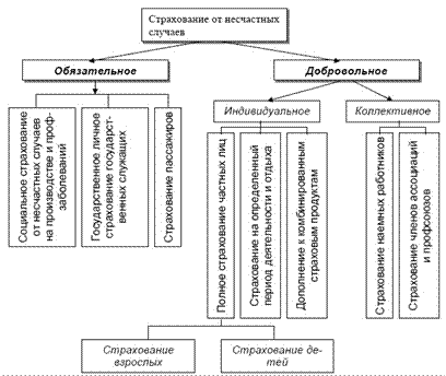 Выделяют множество разновидностей страхования жизни. Рассмотрим некоторые из них. Под страхованием жизни принято понимать предоставление страховщиком в обмен на уплату страховых премий гарантии выплатить определенную сумму денег (страховую) страхователю или указанным им третьим лицам в случае смерти застрахованного или его дожития до определенного срока. Договоры страхования жизни заключаются на срок не менее одного года, поэтому в страховании жизни может сочетаться сберегательная и рисковая функции. Распространенным видом страхования является популярное в зарубежных странах смешанное страхование на случай смерти и дожитие. В Российской Федерации в смешанное страхование жизни чаще всего включается также страхование от несчастного случая. Таким образом, страховая ответственность по смешанному страхованию жизни в нашей стране предусматривает выплаты страховой суммы в следующих случаях: при дожитии застрахованным до окончания срока страхования; при потере здоровья от несчастного случая; при наступлении смерти застрахованного. Страхование жизни служит дополнением к системе государственного социального обеспечения и направлено на защиту семьи в случае потери кормильца и дохода умершего члена семьи; обеспечение в случае временной или постоянной утраты трудоспособности (инвалидности); обеспечение пенсии в старости; накопление средств для оказания материальной поддержки детям при достижении совершеннолетия; оплату ритуальных услуг. Договор смешанного страхования жизни заключаются с физическими лицами. При отборе страхователей страховщик руководствуется тремя критериями: возрастом страхователя и состоянием его здоровья как главными факторами, определяющими уровень смертности, а также гражданством страхователя. Договоры смешанного страхования жизни могут заключаться на различные сроки. Подавляющее большинство страхователей предпочитают 5-летний срок страхования, который позволяет оптимально сочетать их сберегательные и рисковые интересы. Этот вид страхования предназначен для возмещения ущерба, вызванного потерей здоровья или смертью застрахованного. Может осуществляться в групповой и индивидуальной формах; в формах добровольного и обязательного страхования. Основная цель страхования от несчастных случаев - возмещение ущерба, нанесенного здоровью и жизни застрахованного в результате несчастного случая или наступления заболевания. Рассмотрим принципы, на которых базируется страхование от несчастных случаев. Важнейший из них - ограничение объема страховой ответственности оговоренными последствиями несчастного случая, происшедшего с застрахованными в период страхования. Такое ограничение обеспечивает доступность страховых тарифов и способствует широкому развитию страхования от несчастных случаев как непосредственного дополнения социального страхования. Основу договоров страхования от несчастных случаев составляют краткосрочные виды. В объем страховой ответственности страховщика по договорам страхования от несчастных случаев включаются последствия, к которым приводит несчастный случай. Классификация форм и видов страхования от несчастных случаев приведена на рисунке 1.