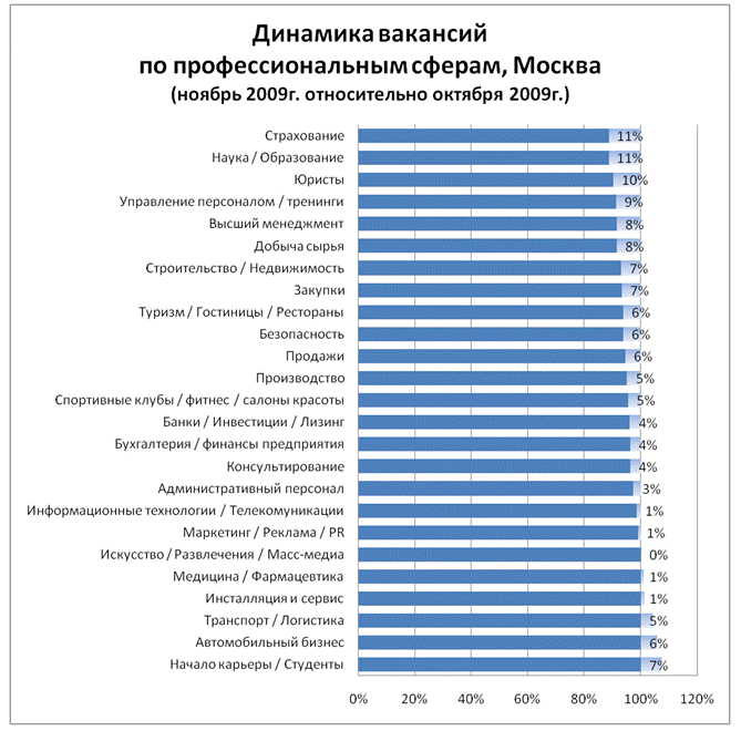В отличие от октября 2009 г., в ноябре наблюдалось небольшое уменьшение числа публикуемых вакансий в большинстве профессиональных областей. Рост спроса происходил только в следующих профессиональных сферах: · Начало карьеры / студенты (+ 7%) · Автомобильный бизнес (+6%) · Транспорт / логистика (+5%) · Медицина / фармацевтика (+1%) · Инсталляция и сервис (+1%)