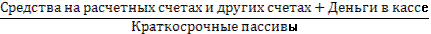 где: ДС – Денежные средства, КП – краткосрочные пассивы Этот коэффициент показывает, какая часть краткосрочных заемных обязательств может быть при необходимости погашена немедленно. · Коэффициент быстрой ликвидности Показывает, какую часть текущей задолженности организация может покрыть в ближайшей перспективе при условии полного погашения дебиторской задолженности.