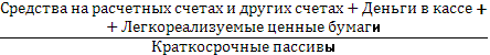 где: ТА - текущие активы; ВБ - валюта баланса; ДК – добавочный капитал; ЧП – чистая прибыль; УК – ставный капитал; ВР – выручка от реализации. В результате подсчета Z – показателя для конкретного предприятия делается заключение: - если Z < 1,81 - вероятность банкротства составляет от 80 до 100%; - если 2,77 < Z < 1,81 - средняя вероятность краха компании от 35 до 50%; - если 2,99 < Z < 2,77 - вероятность банкротства не велика от 15 до 20%; - если Z < 2,99 – ситуация на предприятии стабильна, риск неплатежеспособности в течении ближайших двух лет крайне мал. 3. Оценка ликвидности и платежеспособности. · Коэффициент абсолютной ликвидности.