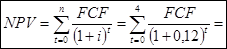 | "Чистый приведенный денежный поток" рассчитывается через дисконтирование "чистого денежного потока" по ставке дисконта для корпораций (I = 12% или i = 0,12)