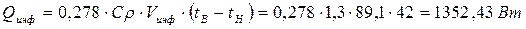 где 3 (м3 ∙ч)/м2 – нормируемая кратность воздухообмена в помещении. Количество тепла, необходимого на нагрев данного объема воздуха определяется: