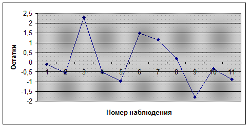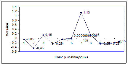 Проверяем случайность остатков. Согласно предпосылкам МНК возмущение должно быть случайной величиной с нулевым математическим ожиданием. Это имеет место для получения однофакторной регрессии. График остатка (возмущения, ошибки) располагается в горизонтальной полосе. Имеется большое количество локальных экстремумов (максимумов и минимумов). -значит остатки случайные.