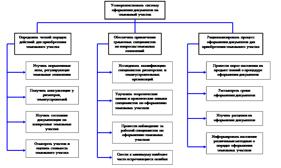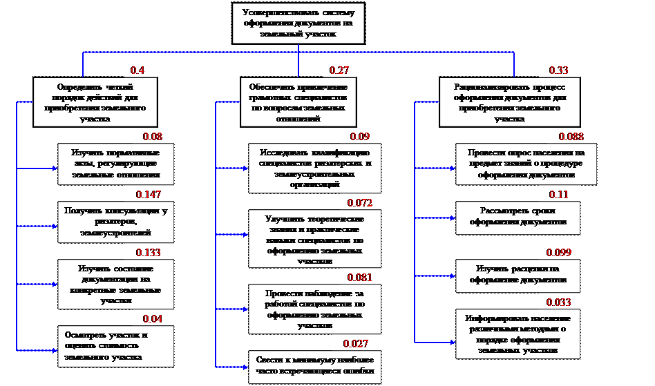 После принятия принципиального решения об оформлении документов для приобретения земельного участка (постановка цели) возник целый ряд взаимосвязанных проблем. Здесь все зависит от того, насколько полно будут владеть информацией граждане - участники сделок с земельными участками. Для этого они должны получить достоверную консультацию у специалистов – риэлтеров. Именно от того, как объяснят процедуру оформления риэлтеры будет зависеть успех. Они определяют весь порядок оформления, советуясь с землеустроителями, оценщиками и госслужащими. Риэлтеры также влияют на принятие решений граждан, они направляют их, предлагая разные способы оформления. Говорят как быстрее и дешевле получить тот или иной земельный участок. Госслужащие на основе анализа действующего законодательства и обсуждения с риэлтерами определяют порядок подачи заявки, порядок постановки на государственный кадастровый учет (ГКУ), порядок предоставления правоустанавливающих документов на земельный участок и т.п. К внешней среде относятся средства массовой информации, разговоры между другими гражданами, обстановка в местах проведения консультаций и т.п. Внешняя среда влияет непосредственно на настроение граждан, их настрой. Риэлтеры должны быть заинтересованы в удовлетворенности всех граждан, обратившихся к ним, так как это безусловно сказывается на репутации риэлтерского агентства, кроме того на мой взгляд риэлтеры должны быть заинтересованы в том, чтобы граждане, получившие их услуги, советовали другим людям обращаться именно в их агентство. Граждане, пришедшие получить консультацию, должны оставить в себе только приятные впечатления и знать, что агентство возьмет на себя почти все проблемы в процедуре оформления. Выделим элементы самого порядка оформления – это подача заявки (может подаваться как риэлтером, так и самими гражданами), техническая работа (выезд на участок, его обмер, обмер здания, если таковое имеется, камеральная обработка полученных результатов, техническая инвентаризация здания – выполняется землеустроителями, специалистами техинвентаризации), формирование землеустроительного дела (окончательная обработка технических работ – выполняется инженерами-землеустроителями), постановка на ГКУ (получение кадастрового паспорта на земельный участок, кадастрового паспорта объекта недвижимости – выполняется госслужащими - работниками Роснедвижимости), оформление правоустанавливающих документов (подготовка распоряжений органами местного самоуправления), государственная регистрация права на земельный участок (проводится работниками Регистрационной службы). Проблемы возникают именно во время взаимодействия элементов и подсистем, если какой-то составной элемент системы не работает или работает не в полную силу, то в процессе выполнения плана возникают новые проблемы. Нужно исключить все недостатки и определить лучшие способы достижения цели с наименьшими затратами. Таким образом, оформление документов на земельный участок - это комплексная проблема, требующая всестороннего анализа, и применения для своего решения, как математических методов, так и учета мнения специалистов. 3.1 Построение дерева целей и расчет количественных оценок. Экспертные методы широко используются при определении коэффициентов относительной ва