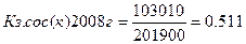 Коэффициент обеспеченности собственными оборотными средствами определяет степень обеспеченности организации собственными оборотными средствами, необходимыми для ее финансовой устойчивости, и рассчитывается как отношение разницы собственных средств и скорректированных внеоборотных активов к величине оборотных активов. Если значение коэффициента больше или равно единице, предприятие за счет собственных оборотных средств полностью обеспечивает свои оборотные активы, и имеет абсолютную финансовую устойчивость. Чем ниже значение коэффициента, тем неустойчивее финансовое состояние предприятия. Предприятие достигает критического финансового состояния, когда коэффициент имеет значение 10% и ниже. Можно сказать, что на начало отчетного года, предприятие достигло критическое финансовое состояние, так как коэффициент имел значение 2.6%. что меньше 10%. Но уже к концу года, наблюдается, что предприятие за счет собственных средств полностью обеспечивает свои оборотные активы и имеет практически абсолютную устойчивость. Коэффициент обеспеченности запасов собственными оборотными средствами: