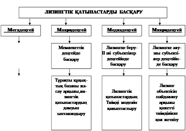 Сурет-3 . Лизингтік қатынастарды басқару деңгейлері. Әр түрлі халықаралық ұйымдар үкіметтік емес ұйымдардың , университеттердің , халықаралық агенттіктердің және жергілікті басқару органдарының көмегімен арнайы Жобалар жасау арқылы елдегі лизингтік қатынастардың дамуы үшін қолайлы жағдай жасай отырып , лизингтік қатынастарды мега деңгейде басқаруда маңызды рөл атқарады. ҚР- да халықаралық даму жөніндегі АҚШ агенттігінің қаржылық қолдауымен 2003 жылы лизингтті дамыту бойынша жоба өз қызметін бастады. Бұл жобаның негізгі мақсаты лизингтік қатынастарды реттейтін заңдылықтарды жетілдіру үшін мемлекеттік басқару органдарына және Парламентке ұсынастар беру , қаржылық және кәсіпкерлік орталарда лизинг туралы танымдалық танымдылықты жоғарылату және лизингтік сектордың ресурстық базасын кеңейту бойынша көмектер жасау болып табылады. Қазіргі кезде осы жобаның бірінші және екінші кезеңдері толық іске асырылған. Ал үшінші кезеңін іске асыру үшін Халықаралық қаржылық корпорацияның инвестициялық департаментімен бірлесе отырып , Орталық Азияда лизингті қаржыландыру Қорын құру бойынша жұмыстар жүргізілуде. Лизингтік қатынастарды мега деңгейде басқаруды дамыту үшін шетелдік инвесторлар тартуға көбірек көңіл бөліну қажет. Лизингтік қатынастарды басқарудың нарық талаптарына сәйкес келетін тиімді технологиясын жасау үшін ең алдымен мемлекет макродеңгейлік қатынастарды реттеуші ретінде неғұрлым маңызды роль атқарады. Еліміздегі лизингтік қызметтер нарығының қалыптасқаннан бергі уақыт аралығында лизингтік қатынастарды ұйымдастыратын және реттейтін бірнеше нормативті актілердің бекітілгені белгілі . Солардың негізінде лизингтік қызметтер нарығын ұйымдастыру қағидаларын анықтайтын база құрылған. Бірақ лизингтік қатынастарды дамыту бойынша елімізде қабылданған заңнамалық актілердің қабылдау уақыттарына жасалатын талдаулар , көптеген жағдайларда нарықтың мемлекеттен реттеуші шараларды талап еткендігін көруге болады. Яғни , бүгінгі күні мемелекет лизингтік қатынастарға заңнамалық базаның көмегімен жергілікті деңгейлерде реттеулер жүргізіліп отырған жоқ. Сондықтан да , біздің қазіргі таңда ҚР-ғы лизингтік қатынастарды мемлекеттік деңгейде басқарудың кейбір тетіктерін сапалық жағынан келесідей бағыттар бойынша қажет екендігін ұсынамыз: 1. Лизингтік қатынастарды әр түрлі келісім шарттық қатынастардың элементтерінен тұратын инвестициялау тетігі ретінде оның әлеуметтік-психологиялық аспектілерін түсіндіруге мүмкіндіктер беретін қосымша заңнамалық нормативтік базаны қалыптастыру қажет. Ол үшін лизингтік қатынастарға байланысты қазіргі уақытта жұмыс істеп жатқан заңнамалық құжаттарды түсіндіретін « төменгі » деңгейдегі , яғни әдістемелік нұсқаулар жасап оларды қолданысқа енгізу керек. 2. ҚР-да лизингтік қатынастарды құру қағидаларын толық қалыптастыруға жауап беретін құқықтық реттеу тетіктерін жасау және оларды нақты қолданысқа енгізу керек . Бұл жерде ең алдымен , « қаржылық лизинг » түсінігінен белгілі бір ерекшеліктері бар « оперативті лизинг » деп аталатын жаңа тетікті қолдануға өту үшін қажетті құқықтық базаны қалыптастыру керектігі айта кеткен жөн. Себебі , шетелдік тәжірибе көрсетіп оырғандай кейбір объектілерді әсіресе , құрылысты жүргізуге қажетті құрылғыларды оперативті лизинг н