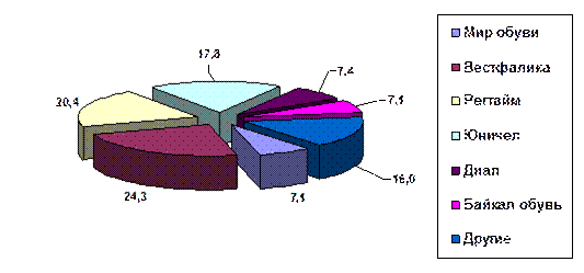 Далее проанализируем конкурентов исследуемой фирмы. Конкурентами фирмы «Регтайм» в г. Ангарске являются следующие торгоые предприятия: - «Юничел» - фирменные обувные магазины: адрес: г. Ангарск, К. Маркса, 46 и г. Ангарск, 22 м/н, дом 6; - Фабрика обуви - Пешеход, магазин: г. Ангарск, 30 кв-л, дом 3; - Сибирячка: г. Ангарск, 84 кв-л, дом 16; - Регтайм, магазин: г. Ангарск, 80 кв-л, дом 1, 85 квартал, Олимпиада, квартал 205 кв-л, дом 3; - Подарки: г. Ангарск, Ворошилова, 12; - Диал, обувная компания: г. Ангарск, 188 кв-л, дом 7; - Вестфалика, магазин: г. Ангарск,106 кв-л, дом 1; 30 кв-л, дом 3; - Байкал обувь: г. Ангарск, 85 кв-л, Олимпиада. Все вышеперечисленные торговые предприятия занимаются розничной торговлей обуви. В таблице 2.12 представлена доля вышеперечисленных конкурентов исследуемой фирмы на рынке обуви г. Ангарска в 2009 г. Таблица 2.12 Конкуренты фирмы «Регтайм»