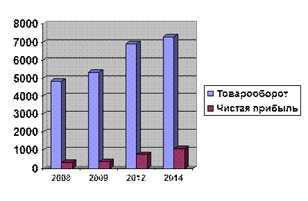 Рис. 3.1 Динамика товарооборота и чистой прибыли с 2009 по 2014 гг. на торговом предприятии