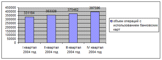 *Рассчитано по: [13, с.99]. На рисунке 2.5. представлен прогноз, полученный на основе трендовой модели по представленному ряду динамики. Таким образом, в 2004 году в России ожидается рост показателя объемов операций выполняемых с использованием банковских операций на 20% или с331 по 398 млн. руб. Рисунок 2.5. Динамика операций совершенных физическими и юридическими лицами с использованием банковских карт (млн. руб.)*