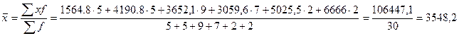 x мо = 200+100*0,67≈267 (млрд.руб.) В данной совокупности наиболее часто встречаются банки со средним размером прибыли 267 млрд. руб. Медиана определяется по формуле: где Ме -медиана; Х о - верхняя граница медианного интервала; h - величина интервала; N = ∑ f i - общая численность; S ме-1 – накопленные частоты предмедианного интервала; f ме - частота медианного интервала. Последняя накопленная частота – 30. Медианный интервал должен содержать единицу совокупности, которая делит всю совокупность из 30 банков пополам (30/2=15). Значит, в качестве медианного в расчете берем интервал 200-300, так как средний размер прибыли до 267 млрд.руб. имеют 9 банков из данной совокупности. Интервалу 200-300 соответствует накопленная частота 19 – именно в данном интервале находится значение признака, которое разделит совокупность пополам: 15 банков будут иметь средний размер прибыли ниже медианного и 15 банков - выше медианного. Произведем вычисление медианы: