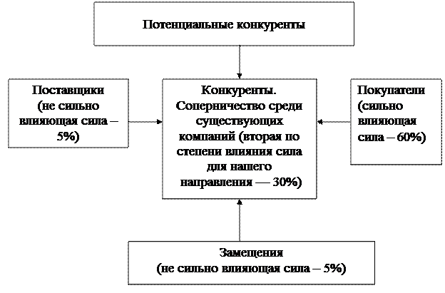 Маркетинговый анализ деятельности предприятия Деловое общение на данном этапе играет большую роль. Оно позволяет легко войти в контакт с другими людьми, подняться выше своих личных предубеждений и достичь желаемого коммерческого результата. Моей целью является стремление воздействовать на партнеров за счет использования их интересов для повышения результативности своей деятельности. Для этого формой делового общения я выбираю презентацию , в моем случае это презентация открытия. Естественно я организую самостоятельную акцию, посвященную представлению Интернет-кафе приглашенной аудитории. На протяжении 2-х часов, с присутствием торжественной части и культурной программы, с наличием фуршета. Сценарий программы включает в себя представление ведущим руководителей фирмы и особо важных гостей. Предоставление слова руководителям фирмы для кратких сообщений с демонстрацией технологий, макетов и т.д.; предоставление время на вопросы присутствующих и ответы специалистов; слово гостям для пожеланий, комментарий, поздравлений, вручение сувениров, памятных альбомов, обмен визитками. Целевой аудиторией в данном случае может являться директора, начальники, доверительные лица компьютерных салонов, для возможного сотрудничества в виде спонсирования необходимой техникой для моего салона. Второй формой делового общения я выбираю представительский прием. Он включает в себя общение сотрудников фирмы с гостями. Носит эпизодический характер по случаю знаменательной даты( открытие Интернет-кафе). Сопровождается встречей высоких гостей и делегаций фирм партнера. В программу дневного приема входит первый вид «бокал шампанского (вина)». Время проведения с 12.00 до 13.00 часов, так как это обед, будут подаваться соки, минеральная вода, бутерброды. Напитки разносят официанты, прием проходит стоя, одежда повседневная. Пятифакторная модель анализа конкуренции по М. Потеру для данного предприятия представлена на рис. 1 . Матрица SWOT – анализа для предприятия представлена в таблице 1.