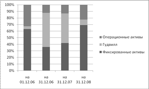 Рис. 4. Вертикальный анализ. Обязательства и капитал Ситуация кардинально изменилась в конце 2006 года, после объединения двух сетей и продажи акций совместного предприятия. Внутренние источники благодаря эмиссионному доходу составляли более 55% финансирования «X5 Retail Group». В 2008 году в период кризиса стоимость акций компании упала практически на 25%, и как следствие руководству «X5 Retail Group» пришлось обратиться к краткосрочным займам. Горизонтальный анализ. Активы.