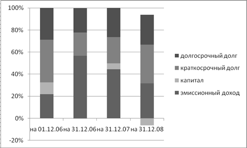 Рис. 2. Вертикальный анализ. Активы. Структура баланса «тяжёлая», процент фиксированных активов в начале и конце учётного периода превышал 60%, что не характерно для специфики ритейлинга, в структуре которого обычно преобладают денежные средства, их эквиваленты и запасы, т.е.операционные активы. Поэтому здесь можно говорить о специфике самой компании, в собственности которой находится значительные торговые площади, как следствие сопутствующее оборудование для магазинов. Стоить также отметить, что в период с конца 2006 года по конец 2007 года в структуре баланса преобладал «гудвилл». В конце 2006 фактически и образовалась компания «X5 Retail Group», что и стала фактором образования гудвилла, в 2008 он обесценился. А поскольку в 2008 году компания купила сеть гипермаркетов «Карусель», то фиксированные активы вполне предсказуемо стали преобладать в структуре баланса. Вертикальный анализ. Обязательства и капитал В течение анализируемого периода можно наблюдать достаточно неоднородную структуру обязательств и капитала (рис.4.) На начало 2006 года эмиссионный доход составлял чуть более 21%, капитал около 10%, следовательно более 60% финансирования компания получала за счёт внешних источников.