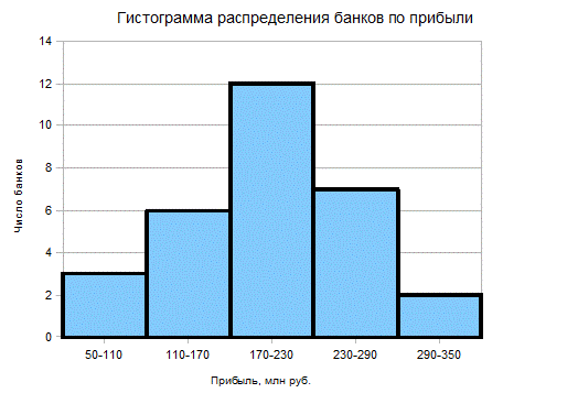 ЗАДАНИЕ 1 По исходным данным: 1.Постройте статистический ряд распределения банков по признаку прибыль, образовав пять групп с равными интервалами. 2.Постойте графики полученного ряда распределения, графически определите значение моды и медианы. 3.Рассчитайте характеристики интервального ряда распределения: среднюю арифметическую, среднее квадратическое отклонение, коэффициент вариации, моду и медиану. 4.Вычислите среднюю арифметическую по исходным данным, сравните ее с аналогичным показателем, рассчитанным в п.3 для интервального ряда распределения. Объясните причину их расхождения. Сделайте выводы по результатам выполнения задания. Выполнение Задания 1 1.1 Построение интервального ряда распределения банков по объему прибыли Для построения статистического ряда, характеризующего распределение банков по прибыли, необходимо вычислить величину и границы интервалов ряда. При построении ряда с равными интервалами величина интервала h определяется по формуле