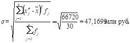 σ=118680/30=62,897 млн руб. Расчет дисперсии: σ2 =61,641 2=3956 Расчет коэффициента вариации: