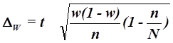 где w – доля единиц совокупности, обладающих заданным свойством; (1- w ) – доля единиц совокупности, не обладающих заданным свойством, N – число единиц в генеральной совокупности, n – число единиц в выборочной совокупности. Предельная ошибка выборки