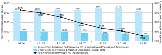 Рисунок – 1. Количество кредитных организаций и их филиалов. Таким образом, в 2009 году продолжилась тенденция к уменьшению числа действующих кредитных организаций (за 2006—2008 годы — на 145), наблюдавшаяся во всех федеральных округах. Крупные многофилиальные банки в 2009 году проводили политику снижения издержек за счет уменьшения количества своих региональных подразделений. Количество филиалов действующих кредитных организаций (без учета Сбербанка) снизилось с 2695 до 2538 (на 5,8%). Сбербанк России ОАО продолжил работу по оптимизации филиальной сети, в результате которой количество филиалов банка за 2009 год сократилось на 130 (на 16,8%). Одновременно с сокращением количества филиалов в 2009 году увеличилось число дополнительных и операционных офисов. Общее же количество внутренних структурных подразделений кредитных организаций за год снизилось на 601 единиц и на 1.01.2010 составило 37 547 (26,5 на 100 тыс. человек против 27 на 1.01.2009). На 1.01.2010, как и ранее, количество филиалов банков других регионов превышало количество местных кредитных организаций и их филиалов во всех федеральных округах, за исключением Центрального федерального округа. Развитие банковской деятельности в регионах В 2009 году сокращение числа действующих кредитных организаций было характерно для большинства российских регионов: количество региональных банков снизилось с 552 до 523. При этом темпы прироста активов региональных банков (15,9%) в 2009 году были выше темпов прироста совокупных активов банковского сектора в целом (5,0%). В результате доля региональных банков в совокупных активах банковского сектора в течение года выросла и по состоянию на 1.01.2010 составила 14,1% (против 12,8% на 1.01.2009). Значительная часть региональных банков сумела нарастить собственные средства (капитал). За год их капитал вырос на 20,6%. Как и в целом по банковскому сектору, увеличение собственных средств (капитала) региональных банков происходило преимущественно за счет уставного капитала и эмиссионного дохода. Следующим по значимости фактором роста собственных средств (капитала) региональных банков явилась переоценка имущества. Кроме того, на рост капитала региональных банков повлияло увеличение требований к его минимальному размеру (региональные банки с капиталом менее 90 млн. рублей на начало 2009 года увеличили собственные средства (капитал) на 6,9 млрд. рублей к 1.01.2010). Удельный вес региональных банков в совокупном капитале банковского сектора изменился незначительно (12,6% на 1.01.2010 против 12,7% на 1.01.2009). В условиях ухудшения финансового состояния предприятий в большинстве отраслей экономики, роста безработицы и снижения платежеспособности населения, вызвавших снижение качества банковских активов, в 2009 году прибыль региональных банков сократилась по сравнению с 2008 годом на 67,1% и составила 18,7 млрд. рублей. По состоянию на 1.01.2010 удельный вес прибыльных региональных банков в общем числе действующих региональных банков уменьшился до 90,3% (против 97,5% на 1.01.2009), в активах региональных банков — до 88,6% (против 91,8% на 1.01.2009). В целом ряде регионов остается острым вопрос об обеспеченности банковскими услугами. По итогам 2009 года минимальное значение совокупного индекса обеспеченности регионов банковскими услугами оставалось у Уральского федерального округа. Некоторое увеличение данного показателя зафиксировано в Южном и Д