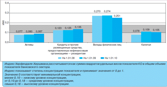 Рисунок – 2. Количество банков с капиталом 180 млн. рублей и их доля в совокупном капитале банковского сектора Уровень концентрации активов банковского сектора в 2009 году оставался невысоким, что обусловлено значительным числом небольших кредитных организаций. На (рисунок - 3) показана динамика индекса Херфиндаля-Хиршмана (далее — ИХХ).