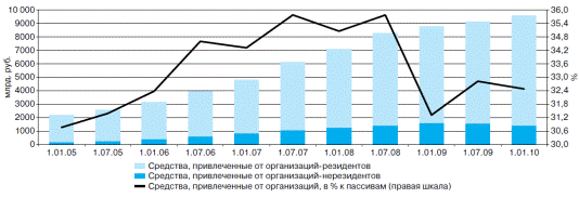 Рисунок – 5. Структура пассивов банковского сектора (%) В числе других заметных изменений структуры ресурсной базы — существенный рост доли вкладов населения. Меры, направленные на поддержание финансовой устойчивости банковского сектора, позволили стабилизировать ситуацию на рынке вкладов физических лиц. В целом годовой прирост объема вкладов физических лиц (включая сберегательные сертификаты), достигших к концу 2009 года 7485,0 млрд. рублей, составил 26,7% по сравнению с 14,5% в 2008 году. Выросла — с 21,1 до 25,4% — и доля этого источника в совокупных пассивах банковского сектора. При этом в первом полугодии 2009 года валютные вклады росли значительно быстрее рублевых (за полугодие темпы прироста составили 21,1 и 5,8% соответственно), что в значительной мере было обусловлено ростом курсов доллара США и евро к рублю. Во втором полугодии (особенно в IV квартале) ситуация кардинально изменилась — вклады в рублях стали расти быстрее, и к концу года их годовой прирост составил 27,2% против 25,4% по валютным вкладам. В целом за год доля вкладов в иностранной валюте незначительно снизилась (с 26,7 до 26,4%). В условиях стабилизации ситуации в банковском секторе и при агрессивной процентной политике не которых кредитных организаций в 2009 году наблюдался быстрый рост вкладов населения в ряде банков, в том числе региональных. На этом фоне удельный вес Сбербанка России ОАО во вкладах физических лиц за 2009 год сократился с 51,9 до 49,4% (до кризиса (на 1.09.2008) он составлял 49,8%). За 2009 год вклады физических лиц, привлеченные на срок свыше 1 года, выросли на 24,0%, в то же время их удельный вес в общем объеме вкладов физических лиц, аккумулированных банковским сектором, сократился с 65,2 до 63,7%. На рынке вкладов физических лиц, привлеченных банковским сектором, по-прежнему доминируют банки, контролируемые государством, в первую очередь Сбербанк России ОАО. На них приходится 56,7% от общего объема вкладов по состоянию на 1.01.2010 (59,0% — годом ранее). Значительная, и в отличие от предыдущей группы возросшая с 23,9 до 25,2%, доля приходилась также на крупные частные банки. Доля малых и средних банков на рынке снизилась (6,2% на 1.01.2010 против 6,8% на 1.01.2009). По итогам 2009 года наибольший удельный вес вкладов в пассивах (37,7%) отмечался у региональных малых и средних банков (на 1.01.2009 — 34,1%). Пассивы банков, контролируемых государством, на 33,8% формировались за счет вкладов физических лиц (на 1.01.2009 — 30,7%); крупных частных банков — на 19,2% (на 1.01.2009 — 14,6%); малых и средних банков Московского региона — на 18,9% (17,0%); банков, контролируемых иностранным капиталом, — на 16,7% (11,6%). Суммарный объем средств, привлеченных от организаций, вырос за 2009 год на 8,9% (за 2008 год— на 24,4%) — до 9557,2 млрд. рублей, а доля данной статьи в пассивах банковского сектора увеличилась с 31,3 до 32,5% (см. рисунок - 6). При этом объем депозитов и прочих привлеченных средств юридических лиц (кроме кредитных организаций) за 2009 год вырос на 10,5% (в 2008 году на 40,5%), а их доля в совокупных пассивах банковского сектора увеличилась с 17,6% на 1.01.2009 до 18,6% на 1.01.2010. Объем депозитов со сроками привлечения свыше 1 года уменьшился на 0,6%, на 1.01.2010 на них приходилось 46,2% общего объема депозитов юридических лиц (на 1.01.2009 — 51,4%).