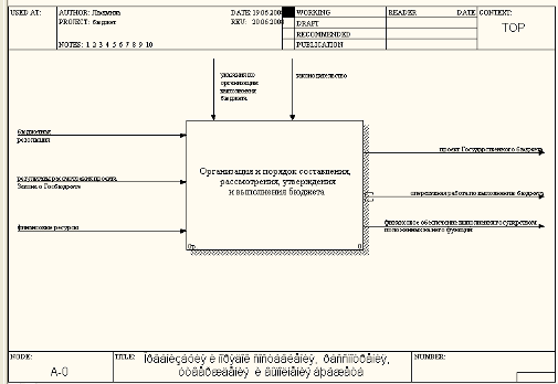 Рисунок 1.3. Модель типа «белый ящик» 1.1.3 Функциональная модель системы Функциональную модель рассмотрим с точки зрения аналитика – человека, который непосредственно занимается анализом и прогнозом динамики финансов данного фонда. Цель функционального моделирования – построение наиболее точного прогноза для максимизации дохода бюджета. Первая диаграмма в иерархии диаграмм – IDEF0 (Рисунок 1.4). Она изображает функционирование системы в целом. Эта диаграмма называется контекстной. После того, как контекст описан, проводится построение следующих диаграмм в иерархии. Каждая последующая диаграмма, является более подробным описанием одной из работ на вышестоящей диаграмме. В нашем случае рассматривается функционирование системы «Бюджетный процесс». Вторая диаграмма демонстрирует основные функции системы (Рисунок 1.5).