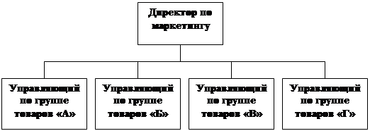 Схема 1. Функциональная структура управления предприятием Базовая структура может быть ориентирована на иной принцип разделения труда и ответственности, в частности, по географическим или отраслевым зонам влияния и работы сотрудников, отдельных групп. Пример такой структуры показан на схеме 2 на примере службы маркетинга. Такая структура применяется диверсифицированными фирмами с широким ассортиментом, разнообразием специфичных условий сбыта и использования товаров. Она целесообразна, если особые черты заложены в товарах, их специфике. Товарная (продуктовая) структура быстро реагирует на потребности рынка, но требует больших кадровых расходов в связи с дублированием функций.