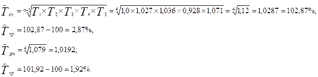 В приведенном примере среднегодовой темп прироста выпуска продукции составляет 2,87 %, а реализации продукции - 1,92 %.