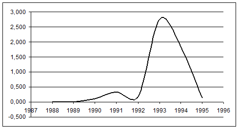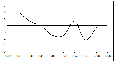 y1988 =2.97+(-0.08)x(-7)+0.04x49+(-0.002)x(-343)=6.06 y1989 =2.97+(-0.08)x(-5)+ 0.04x25+(-0.002)x(-125)=4.56 y1990 =2.97+(-0.08)x(-3)+ 0.04x9+(-0.002)x(-27)=3.6 y1991 =2.97+(-0.08)x(-1)+ 0.04x1+(-0.002)x(-1)=3.09 y1992 =2.97+(-0.08)x1+0.04x1+(-0.002)x1=2.92 y1993 =2.97+(-0.08)x3+0.04x9+(-0.002)x27=2.98 y1994 =2.97+(-0.08)x5+0.04x25+(-0.002)x125=3.16 y1995 =2.97+(-0.08)x7+0.04x49+(-0.002)x343=3.36 Показатель адекватности модели:
