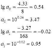 y1988 =3.72+(-0.17x(-7)=4.88 y1989 =3.72+(-0.17) x(-5)=4.55 y1990 =3.72+(-0.17)x(-3)=4.22 y1991 =3.72+(-0.17)x(-1)=3.88 y1992 =3.72+(-0.17)x1=3.55 y1993 =3.72+(-0.17)x3=3.22 y1994 =3.72+(-0.17)x5=2.89 y1995 =3.72+(-0.17)x7=2.55 б) для показательной функции yt =a0 a1 t (при ∑ti =0)