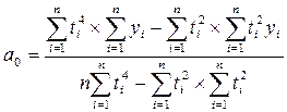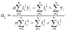 y1988 =3.47x0.95-7 =4.97 y1989 =3.47x0.95-5 =4.48 y1990 =3.47x0.95-3 =4.05 y1991 =3.47x0.95-1 =3.65 y1992 =3.47x0.951 =3.3 y1993 =3.47x0.953 =2.98 y1994 =3.47x0.955 =2.69 y1995 =3.47x0.957 =2.42 в) для параболы второго порядка yi = a0 + a1 t+a2 t2 (при ∑ti =0)
